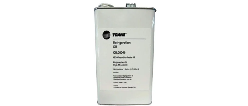 O OIL00048 é um óleo refrigerante POE (Polyolester ISO 68/Miscibilidade com R‑134a) em recipiente de 1 galão (~3,78 L) com peso expedido ~9 lb (~4 kg). Recomendado pela Trane como substituto do obsoleto OIL00155, é formulado especificamente para chillers Trane que operam com refrigerante R‑134a
